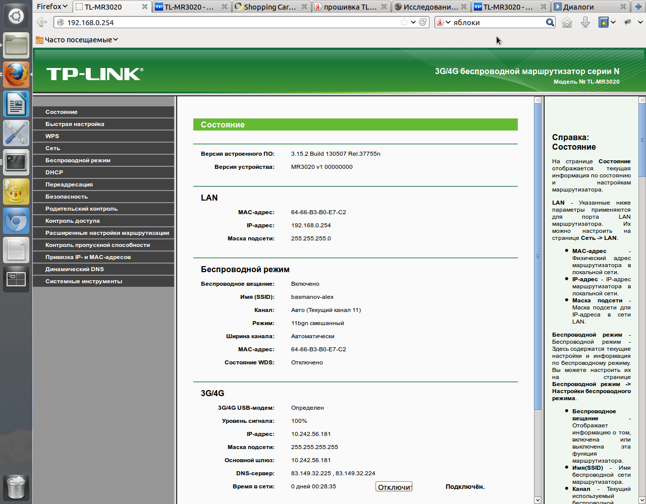 Купил 3G WiFi роутер для раздачи интернета в лесу бывшей женой, его можно подключить к USB выходу компа или к розетке через адаптер. Через ethernet порт устройство выдаёт по dhcp адрес и находится по адресу http://192.168.0.254 логин и пароль по умолчанию admin