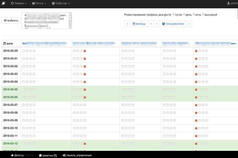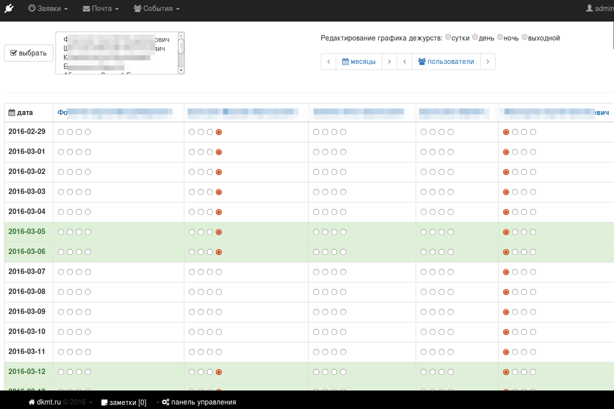 назначение исполнителей, редактирование заявки, назначение дежурных на выходные и праздники |