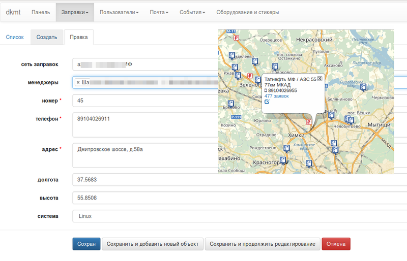 - редактировать данные АЗС можно только в панели управления пользователем с ролю администратор или начальник отдела
