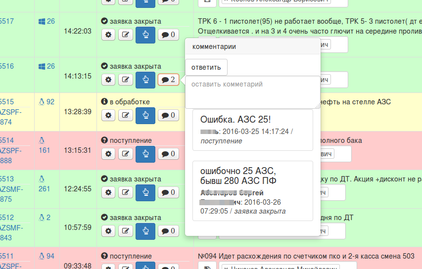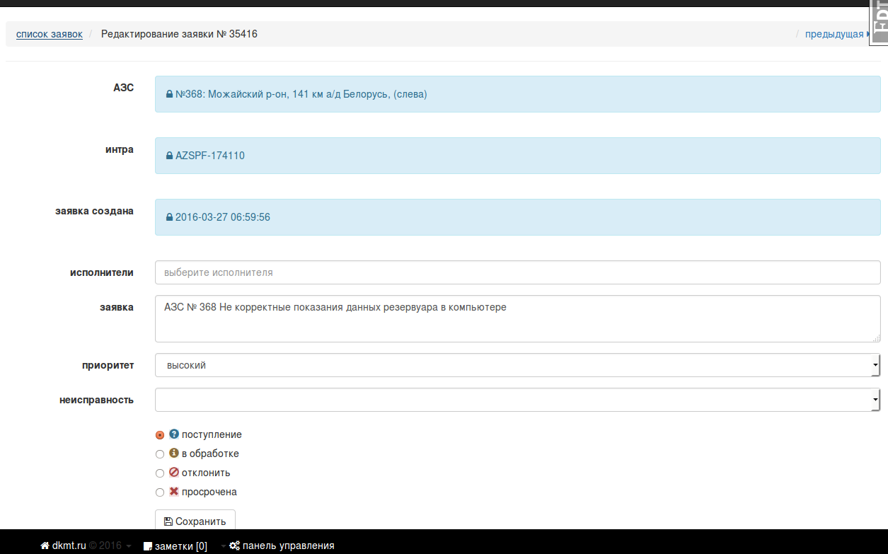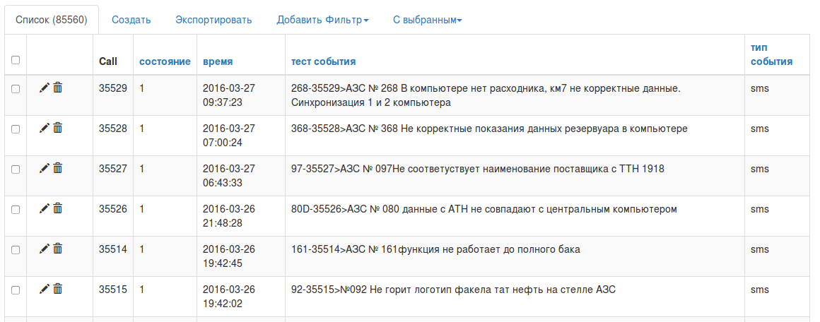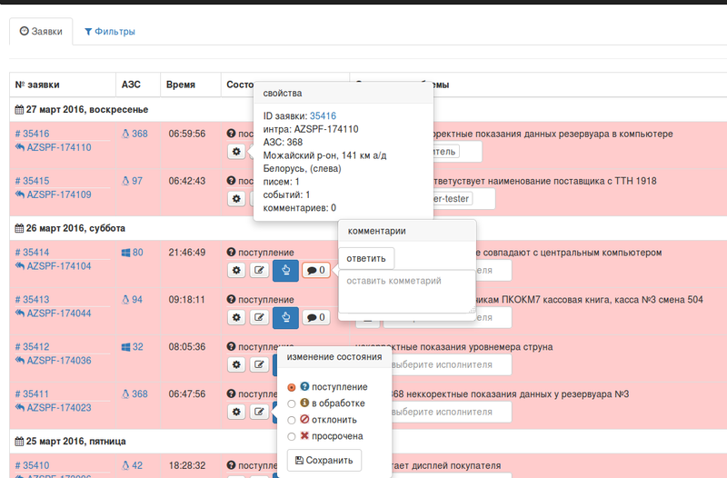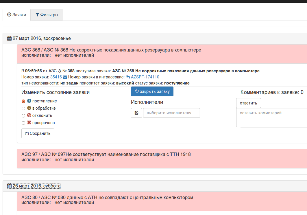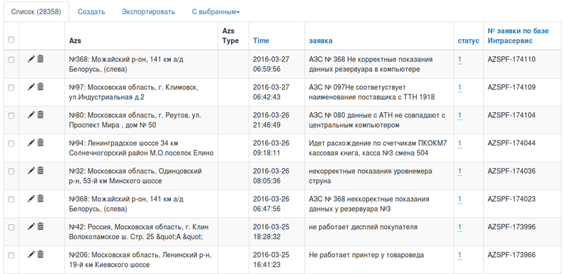 - поиск заявки возможен по номеру АЗС, внутреннему номеру заявки (используется для обработки СМС переписки с исполнителем), внешнему номеру в Интрасервсие, состонияю, типу неисправности и дате поступления