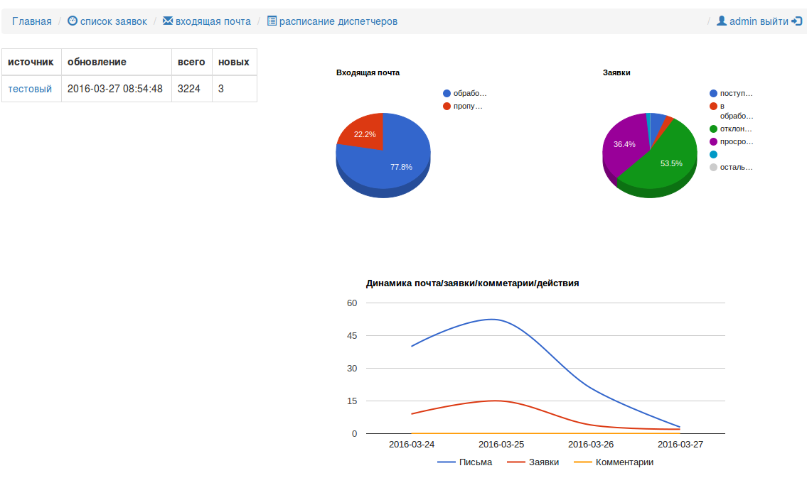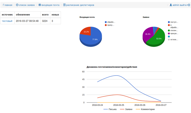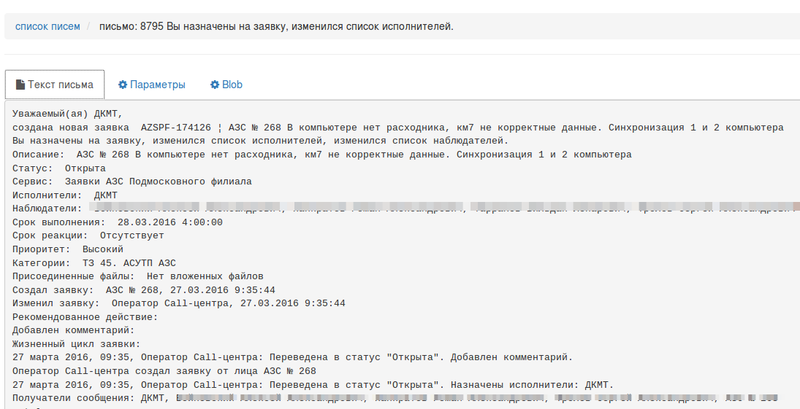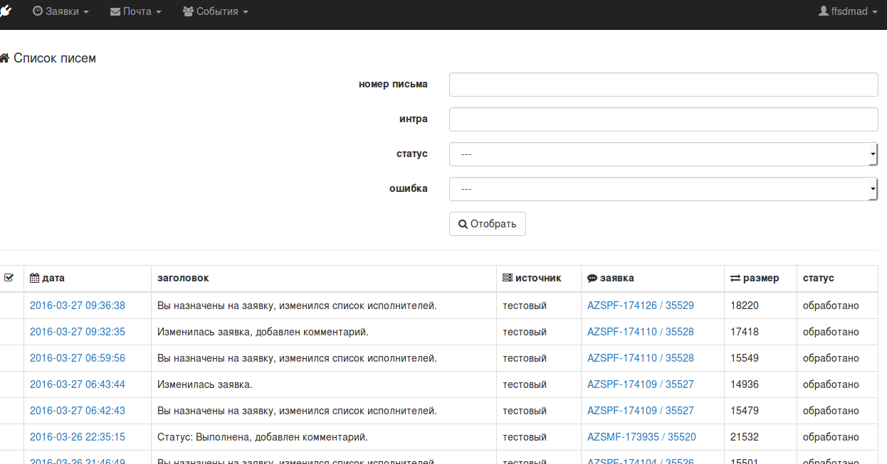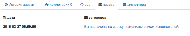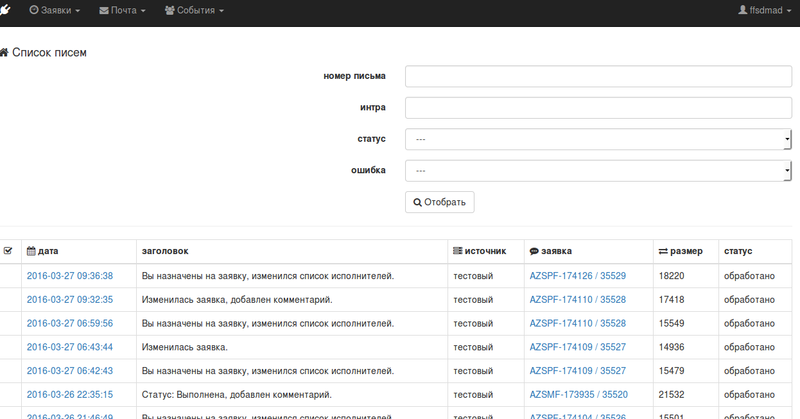 - пользователи с ролью администратор и диспетчер имеют возможность просматривать как всех список входящих писеми, так и списки писем связанных с заявкой