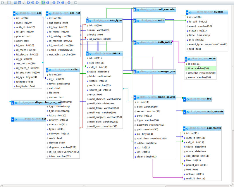 - связана с АЗС, списком исполнителей, цепочкой входящих писем, цепочкой исходяших СМС, список комметариев, история событий заявки